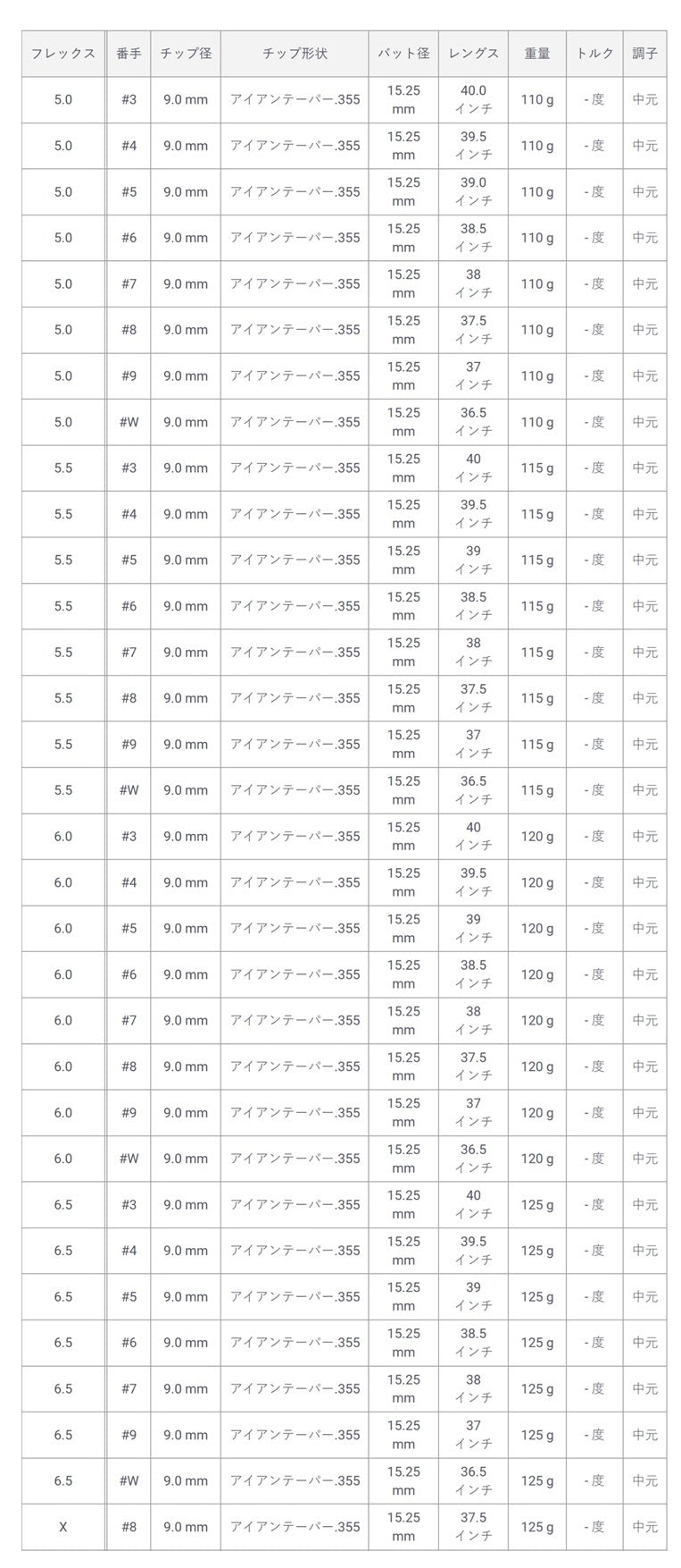 フレックス毎に最適なテーパー率でシャフトの硬度を調節した上、重量もフレックス毎に設定を大きく変えており、ツアー選手用の6.5/125g(カット後118g前後)からアマチュアゴルファーに適した5.0/110g(カット後102g前後)まで幅広く対応しています。