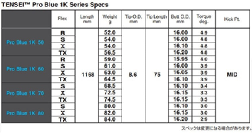 前身のCK(カーボンケブラー)クロスをベースに、三菱ケミカルが独自に開発した1K(ワンケー)クロスを搭載したTENSEI™ Pro 1K ライン。ドレープ性の高い織物状の素材を採用することでしなやかなフィーリングをもたらし、エネルギーロスを最小限に抑えてヘッドへのパワーの伝達効率を高めています。Pro Blue 1Kシリーズはクセのない全体しなりを特徴とするシャフトで適正な打ち出し角とスピン量であらゆるシチュエーションにおいてハイパフォーマンスを実現します。