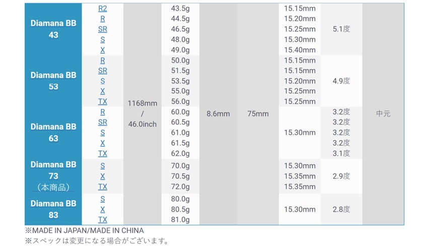 第6世代Diamanaシリーズの第二弾となるDiamana™ BBシリーズは、手元からチップまでなだらかな変曲点の無い剛性によって、多くのプレイヤーの求める自然なしなり戻りを実現するとともに、高慣性モーメントのヘッドに対してもスイートエリアでインパクト出来る様にデザイン。