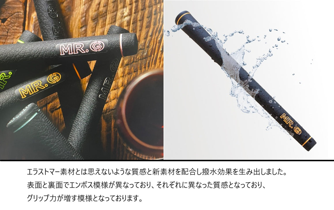 MR.Gグリップは、ゴルフクラブと自身の身体を唯一繋ぐ物であり最も大事な物である。特に気候が左右するゴルフではグリップ力や、他の要素は必須であり、グリップにあたる中指、薬指側 に凸の形状を施し、また、あまり力を入れたくない親指側の形状も変化させている。さらにグリップの素材自体に撥水素材を混ぜ、余分な水分除去を担っていることで、雨の日のゴルフや、手汗など余分な水分をグリップ内に吸収せず、簡単な拭き取りで除去できる。